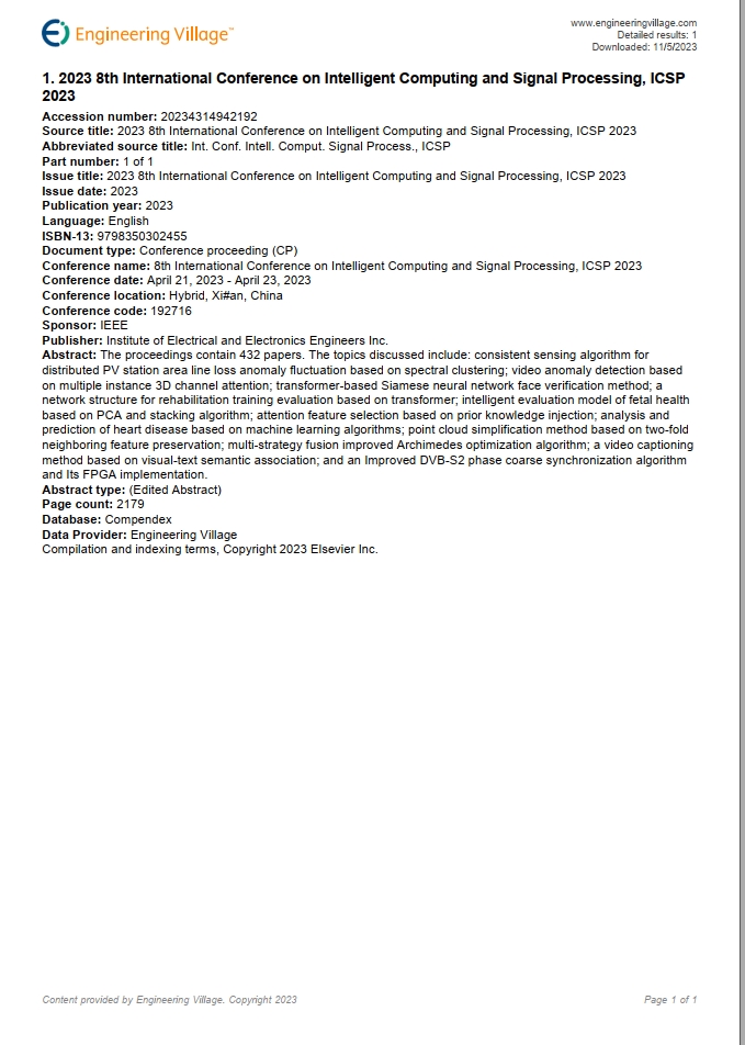 近日,我校主办的2023年第八届智能计算与信号处理国际学术会议(ICSP 2023),论文集已被EI收录检索。检索链接:https://ieeexplore.ieee.org/xpl/conhome/10248366/proceeding