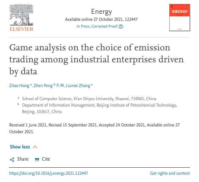 我院电子信息(计算机技术)专业硕士研究生洪子涛同学、导师张留美副教授和北京石油化工学院彭珍教授共同合作撰写的论文《Game analysis on the choice of emission trading among industrial enterprises driven by data》,日前收到国际SCI期刊《Energy》的论文录用接收函,并已完成对该论文样稿的校对,在该期刊网上上线。据悉,《Energy》是由英国佩加蒙爱思唯尔科学有限公司出版,是能源动力领域国际Top期刊,目前影响因子7.147。在中国科学院文献情报中心期刊分区表中(2020年12月最新升级版),属于一区刊物。