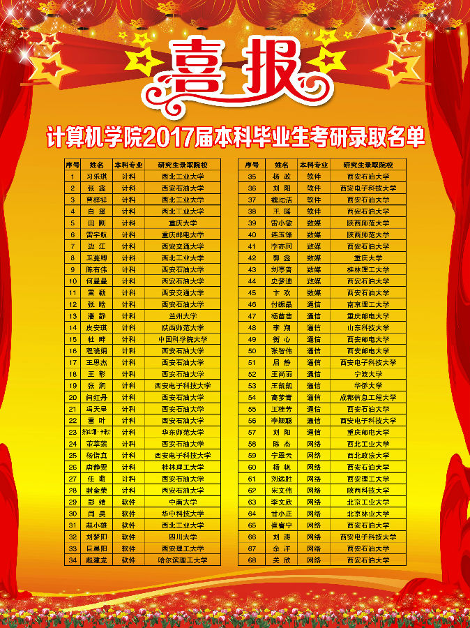 近日,2017年全国硕士研究生招生工作落下帷幕,我院2017届本科毕业生考研工作传来捷报。共有80名同学考研上线,占毕业生总数22.5%,68名同学考研成功,考研录取率为19.1%,创我院考研录取新高。