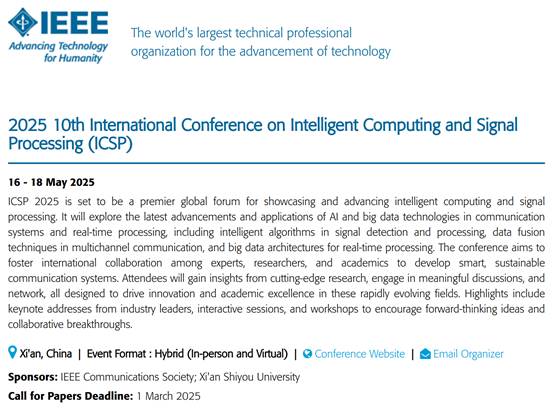 征稿主题包括但不限于智能计算与信号处理、计算机与网络信息安全、人工智能与机器学习、物联网与传感器技术等领域的最新研究成果。本次会议论文集将由IEEE出版,收录进IEEE Xplore数据库,并提交至EI核心和Scopus检索。ICSP 2025已被IEEE收录进会议列表。