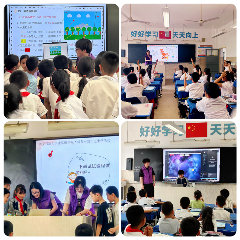 活动当天,学院组织的四支科普宣讲小队分别走进不同班级,结合小学生的年龄特征和学习兴趣,精心设计教学内容和互动环节,通过“知识讲解+趣味游戏+人机互动”相结合的方式,向孩子们生动讲述计算机的发展历程、智能应用、人工智能等前沿知识,让科技理念以贴近生活、通俗易懂的方式走进小学生,在潜移默化中点燃他们探索科技的热情。