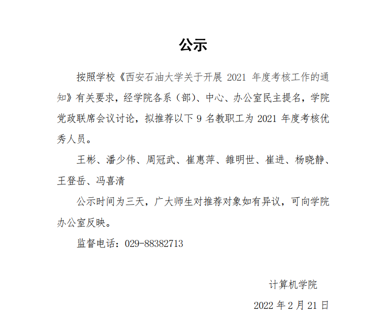 2021年度考核优秀人员公示
