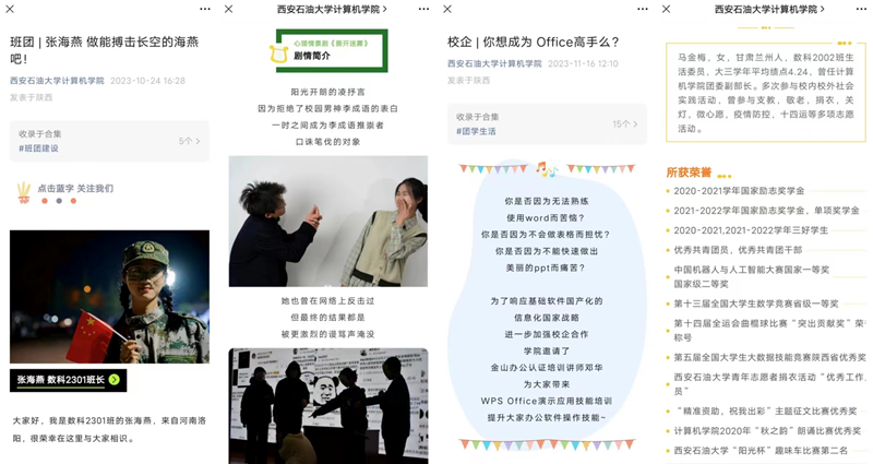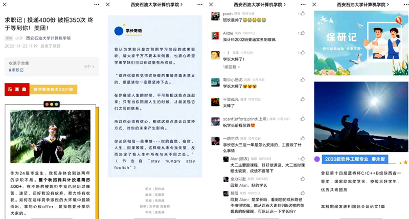 由内而外的积极态度对于学生的个人发展至关重要,它不仅促进了学生对自身职业规划的深入思考,也为学生工作办公室提供了更多与学生互动和服务的机会。例如:通信工程2301班班长胡赫通过学院公众号主动走进办公室,向辅导员询问关于求职与保研的具体信息,反映出学生内在驱动力的觉醒。胡赫同学又因在校表现优异,担任班团干部,推出个人团学干部系列推送《班团|胡赫 想留在陕西的山东人》,激发学生内在的学习动力,以点带面,发挥榜样力量带动学院形成优良班风、学风、校风。毕业生则针对来校走访、招聘的单位来学院办公室咨询相关就业信息,通过已就业学生经历带动未就业学生激发求职动力,明确自身和已就业同学之间的差距,在校弥补自身欠缺,认清就业形势。