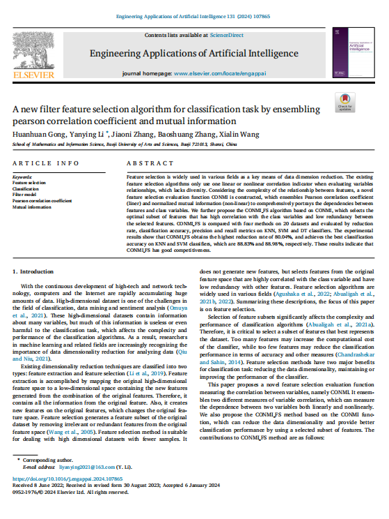 该论文在国际著名学术期刊Engineering Applications of Artificial Intelligence上发表,该期刊属于中科院SCI期刊分区工程类1区Top期刊。公司为该研究论文的唯一完成单位,论文第一作者为公司永利3044集团官网2020级应用数学专业硕士研究生龚欢欢。