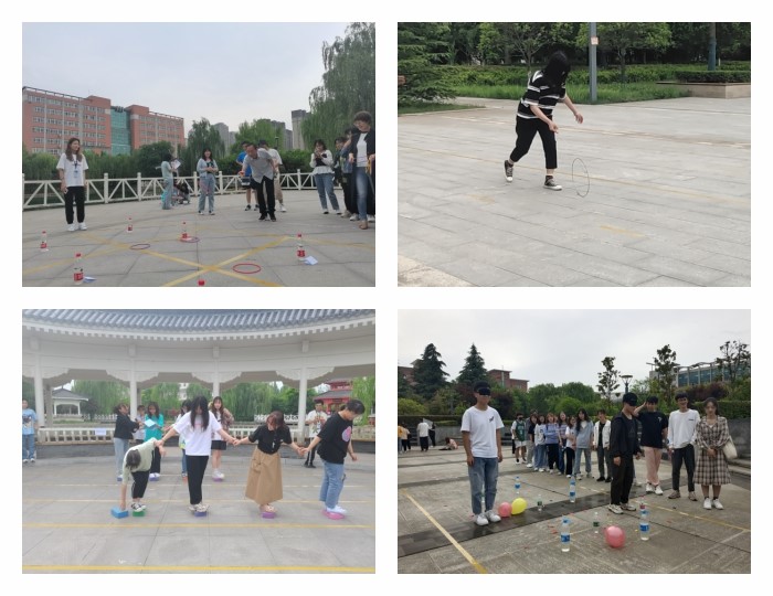 校园游艺会共设有“你划我猜”“圈圈大放送”“搭桥过河”“1+1+1+1”“企鹅跳”“地雷阵”6个游戏项目。员工们4人一组自由组队,通过团队协作完成比赛。师生代表积极参与游戏挑战,现场气氛欢快热烈。