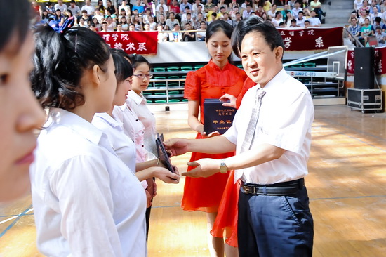王志刚、白黎向毕业生代表颁发了毕业证书;傅志军、赵荣侠为优秀毕业生代表颁发荣誉证书;杨子元为西部志愿者颁发奖金。教务处处长王富平宣读了2013届员工毕业资格审查结果;学工部(处)长、毕业生就业指导服务中心主任李周让宣布了优秀毕业生及老员工志愿服务西部计划员工名单。