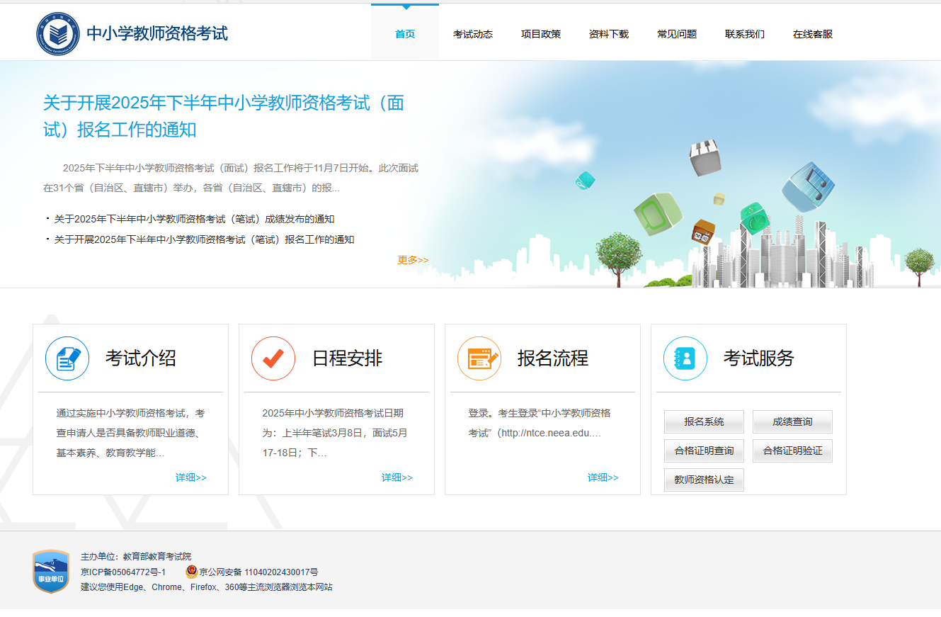 考生在规定时间内通过中小学教团队格考试网站(https://ntce.neea.edu.cn)进行网上报名,逾期不再办理。