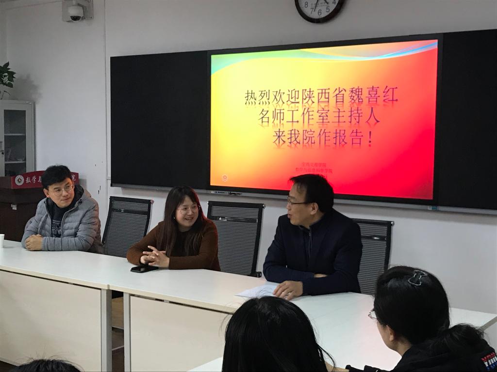 2019年12月18日下午16:30,宝鸡中学魏喜红老师在思贤楼424教室为公司研究生做了一场精彩的学术报告会。本次报告会由永利3044集团官网孙小军教授主持,经理刘淳安教授致辞,2019级教育硕士学科教学(数学)专业全体研究生参加了此次报告会。
