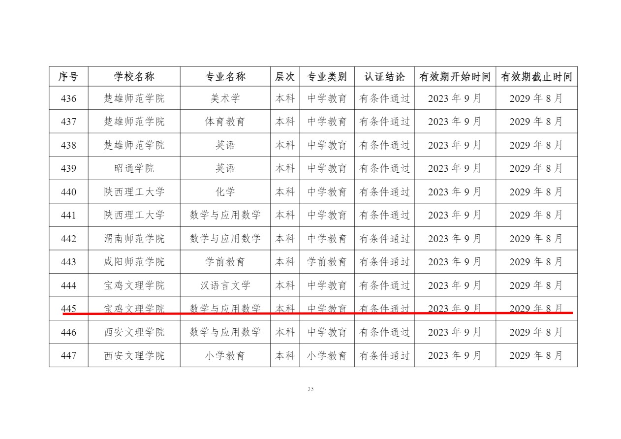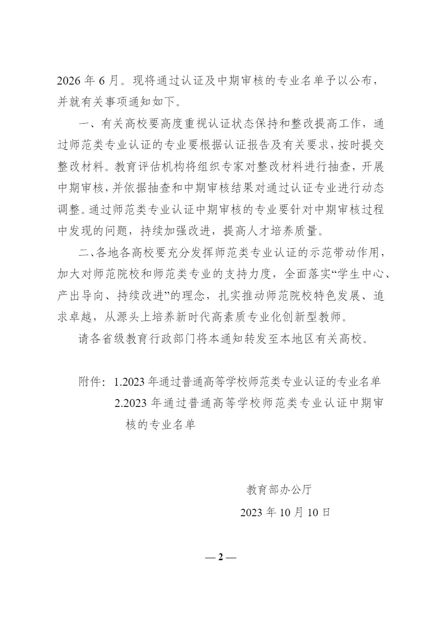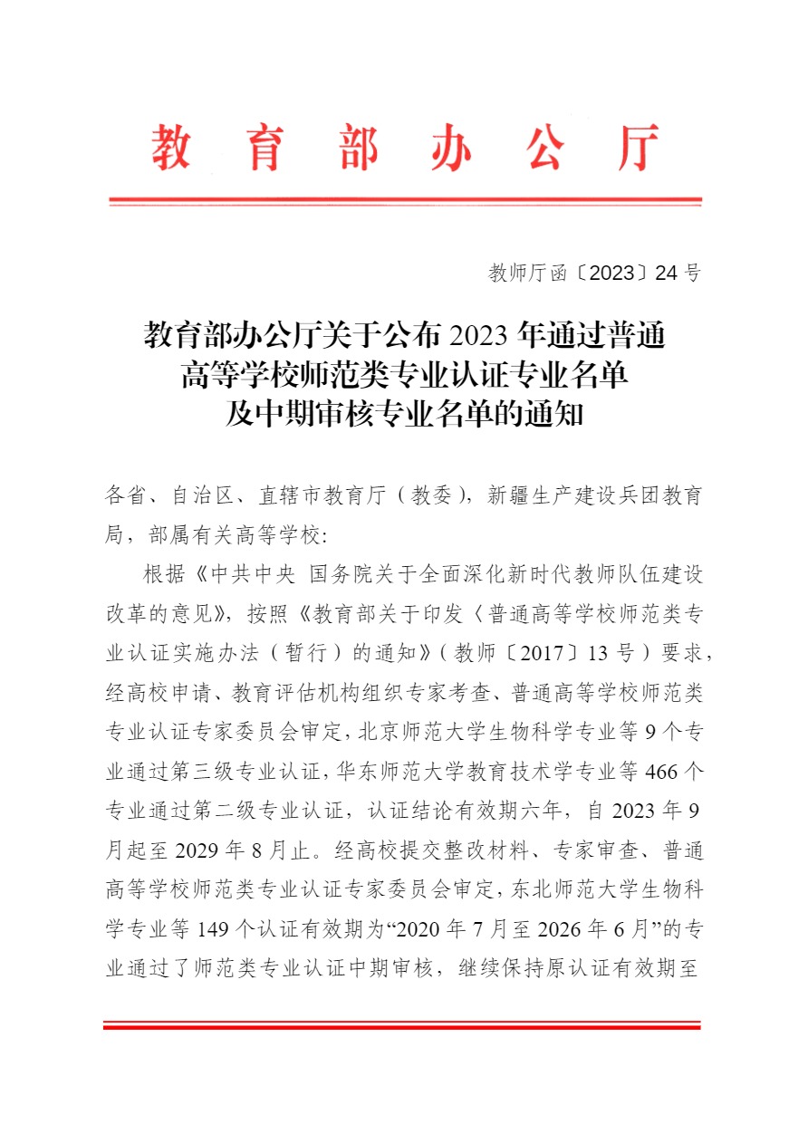 近日,教育部办公厅发布《关于公布2023年通过普通高等学校师范类专业认证专业名单及中期审核专业名单的通知》(教师厅函〔2023〕24号),公司数学与应用数学专业通过教育部师范类专业第二级认证,认证结论有效期六年(自2023年9月至2029年8月)。