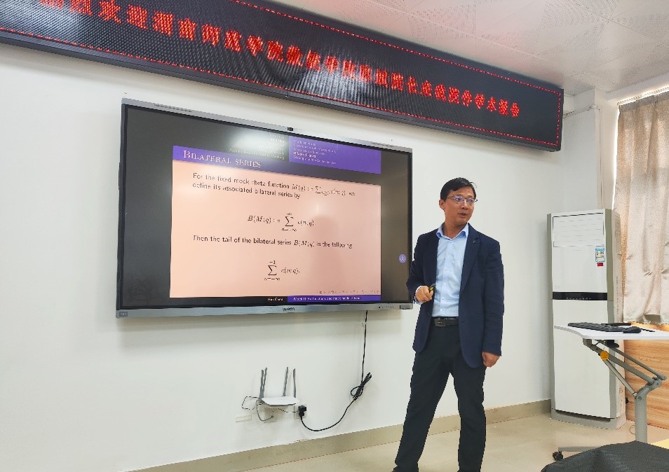 在思贤楼310学术报告室,陈教授做了题为《Mock theta functions and mock modular forms》的学术报告。他从数学家拉马努金的传奇事迹开始,旁征博引介绍了Mock theta 函数及其范式的研究进展,重点报告了他近期关于3种Mock theta 函数范式以及它们之间内在联系的研究。报告过程中,陈教授还分享了学术研究的经验,引起了与会人员的广泛共鸣,激发了在场师生的学术研究热情。