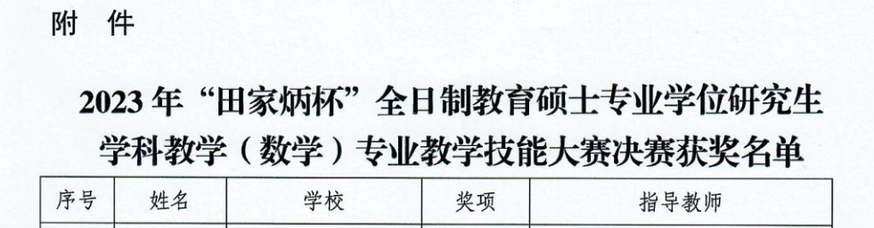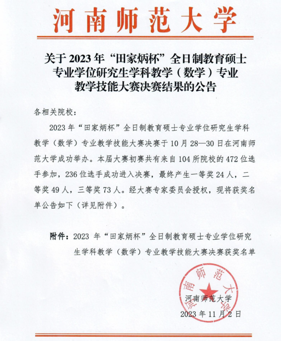 11月2日,2023年“田家炳杯”全日制教育硕士专业学位研究生学科教学(数学)专业教学技能大赛决赛结果在河南师范大学网站公告,公司教育硕士专业学科教学(数学)研究生潘佳怡、任旭东获得三等奖。此次比赛共有来自全国104所院校的472位选手参加,236位选手进入决赛。永利3044集团官网研究生初次参加“田家炳杯”教学技能大赛,四名研究生进入决赛,从初赛到决赛历时五个月,经过选手们精心准备、反复研磨、交流探索、模拟训练,最终两名获得三等奖、两名获得优秀教学设计奖。