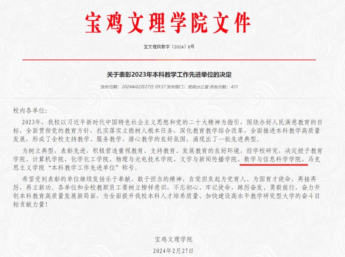 近日,学校公布了《关于表彰2023年本科教学工作先进单位的决定》,学院荣获“本科教学工作先进单位”称号。这是学院自2022年以来连续两年获此殊荣。
