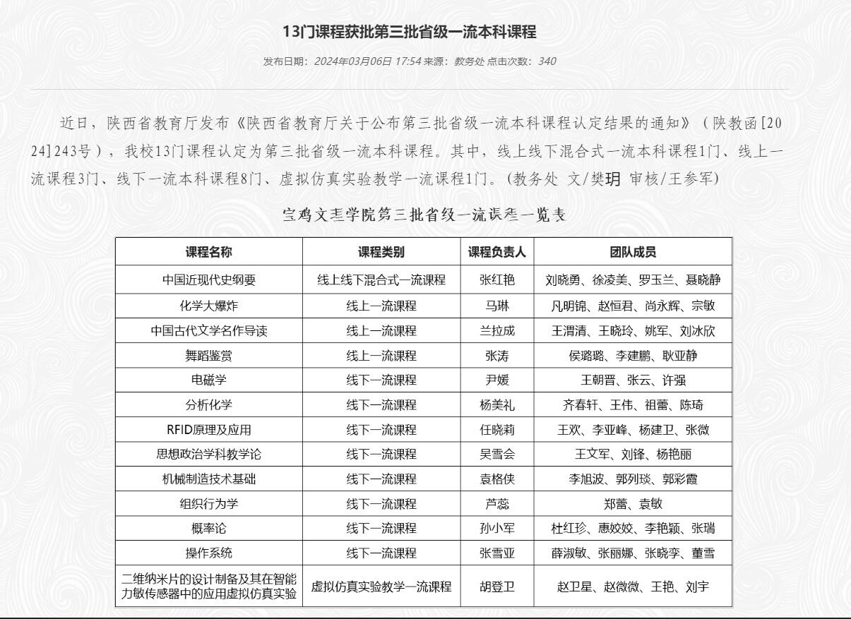 近日,陕西省教育厅发布《陕西省教育厅关于公布第三批省级一流本科课程认定结果的通知》(陕教函[2024]243号),公司孙小军教授课程团队申报的《概率论》课程认定为第三批省级一流本科课程(线下一流本科课程)。