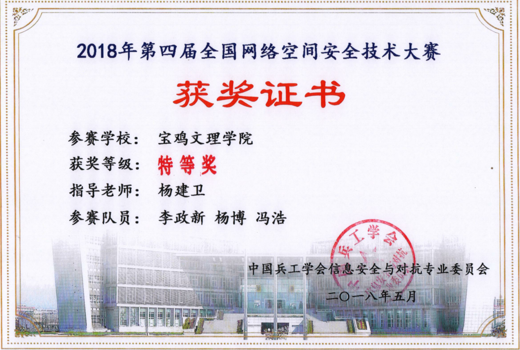 公司员工 杨博 作为参赛队员参加2018年第四届全国网络空间安全技术大赛,获得特等奖。