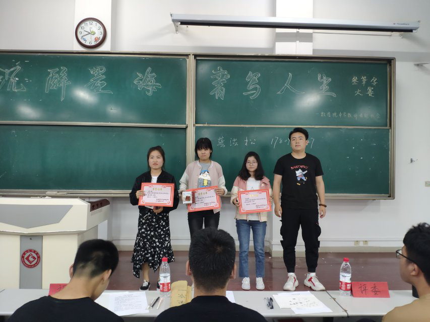 为了加深同学们对数学学科的认识,丰富以"纸笔数为马,双创谱英华"为主题的第三届数学文化节。数学与信息科学学院于5月13日晚19:30-21:30分别在思贤楼408、420教室举办了以“沉醉墨海,书写人生”为主题的三笔字大赛。出席本次活动的评委分别为历史学院李澍洲、历史学院张勃兴、政法学院龚洪松、美术学院边国辉、美术学院王启明以及外国语学院张佳瑶。