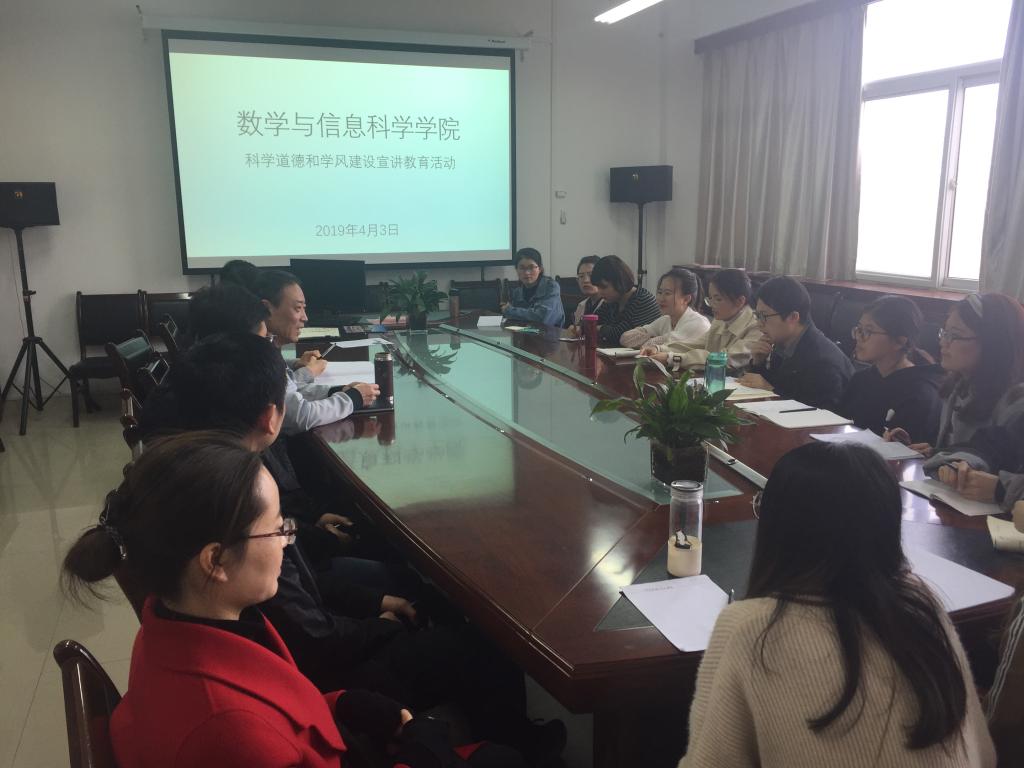 数学与信息科学学院于2019年4月3日下午4:30在思贤楼419面向研究生导师和研究生集中组织开展科学道德和学风建设宣讲教育活动,向导师传达教育厅及学校文件精神,提高硕士研究生科学道德及学风建设的意识。本次宣讲教育活动由永利3044集团官网科研副经理王爱丽主持,书记郝满义、硕士研究生导师及学院全体研究生参加此次活动。