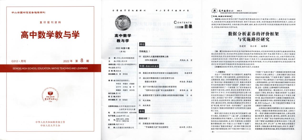 近日,公司永利3044集团官网孙小军教授研究团队完成的研究论文《数据分析素养的评价框架与实施路径研究》一文被中国人民大学复印报刊资料《高中数学教与学》2022年第8期全文转载,原文发表于《数学教育学报》(CSSCI来源期刊、全国中文核心期刊)2022年第2期。公司为该论文的独立完成单位及通讯单位,公司永利3044集团官网2019级学科教学(数学)研究生陈建明为第一作者,孙小军教授为通讯作者。