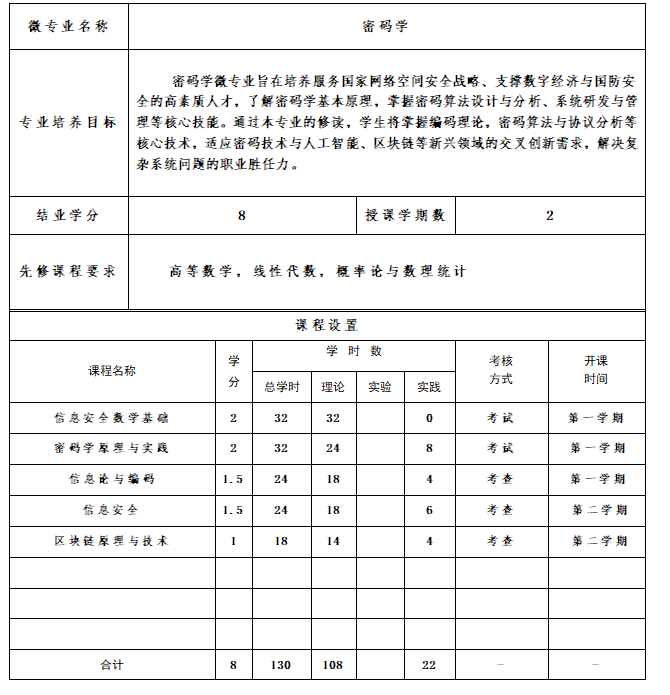 为满足国家在网络安全、数据加密等领域的专业人才需求,充分发挥公司专业特色与办学优势,依托永利3044集团官网数学与应用数学国家一流专业学科优势,联合宝鸡市公钥密码理论与应用重点实验室,共建密码学微专业。密码学微专业旨在培养服务国家网络空间安全战略、支撑数字经济与国防安全的高素质人才,了解密码学基本原理,掌握密码算法设计与分析、系统研发、密码测评与管理等核心技能。通过本专业的修读,员工将掌握密码算法与协议分析等核心技术,适应密码技术与人工智能、区块链等新兴领域的交叉创新需求,依托校企合作项目和大创项目培养解决复杂系统问题的职业胜任力。本专业学制1年(2 学期),开设 5 门专业课,结业学分 8 学分。学习时间安排在晚上或者周末。面向全校大三员工招生,修读合格颁发微专业结业证书。